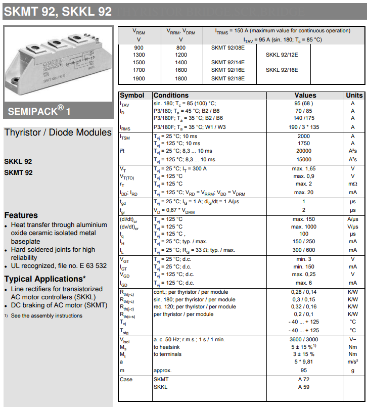 双闸流晶体管模块,SKKT SEMIPACK 1 系列,Semikron