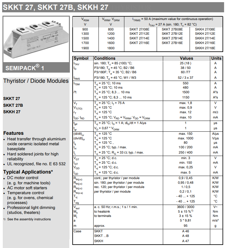 SKKT27,SKKT27可控硅,SKKT27/16E,SKKT27/16E双可控硅模块,