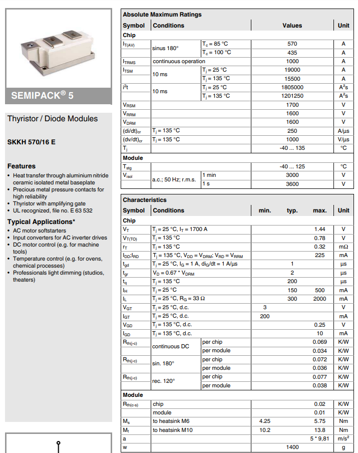 SKKH570,SKKH570可控硅,SKKH570/16E,SKKH570/16E双可控硅模块,